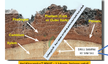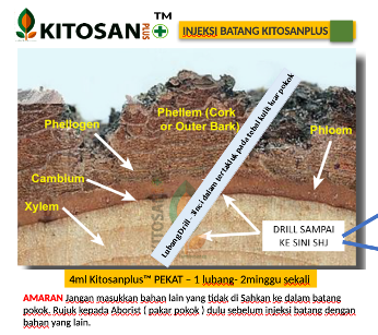 Berikut ialah penerangan penuh berkenaan kaedah injeksi batang (trunk injection) menggunakan kitosan untuk pokok durian – meliputi tujuan, kaedah pelaksanaan, dos cadangan, masa sesuai, dan kelebihannya.